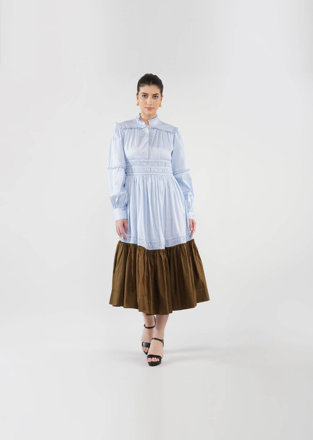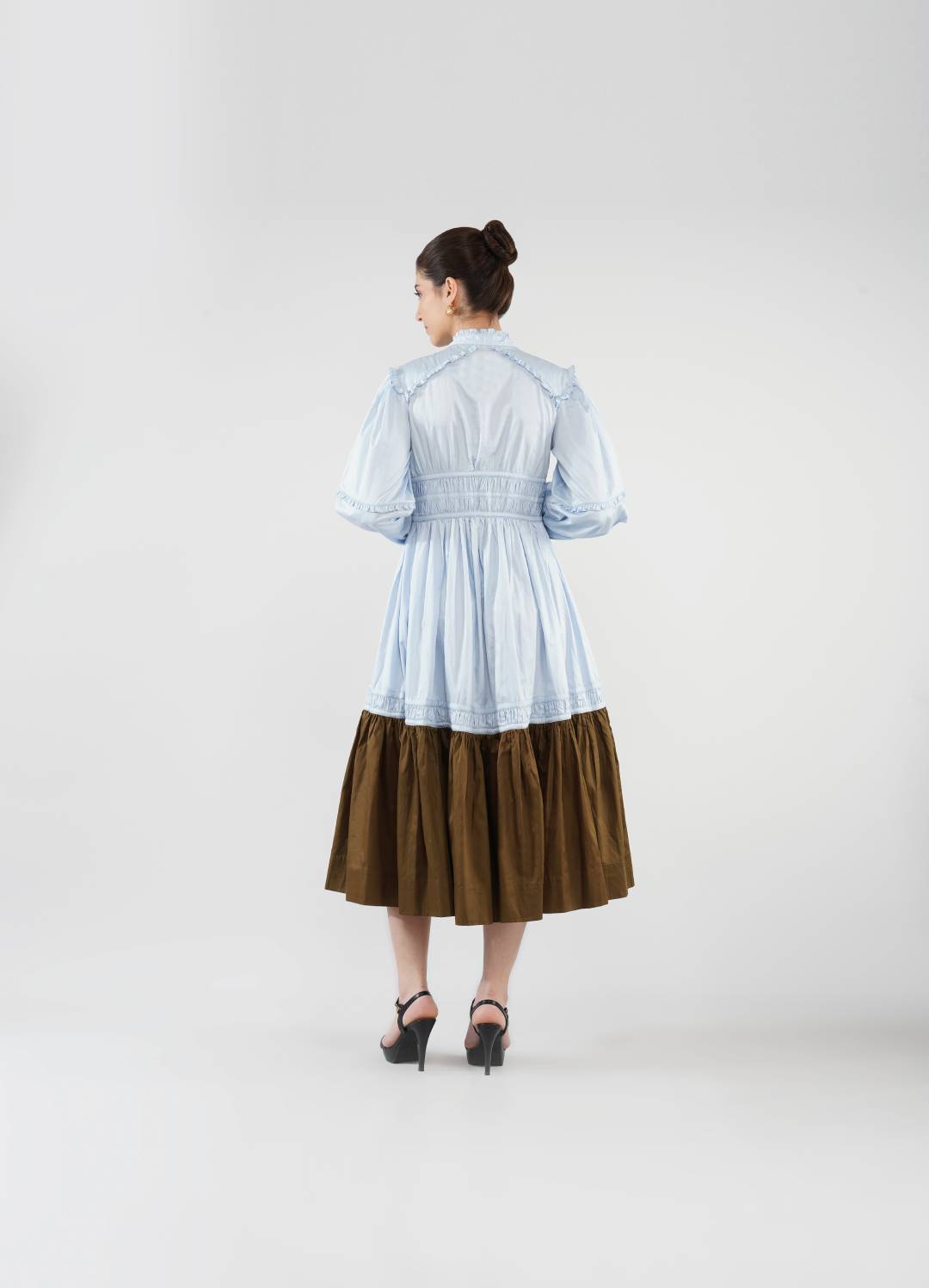 Grace meets ease in this long dress with soft frills, cinched waist, and a dual-tone design blending powder blue and brown for timeless sophistication.