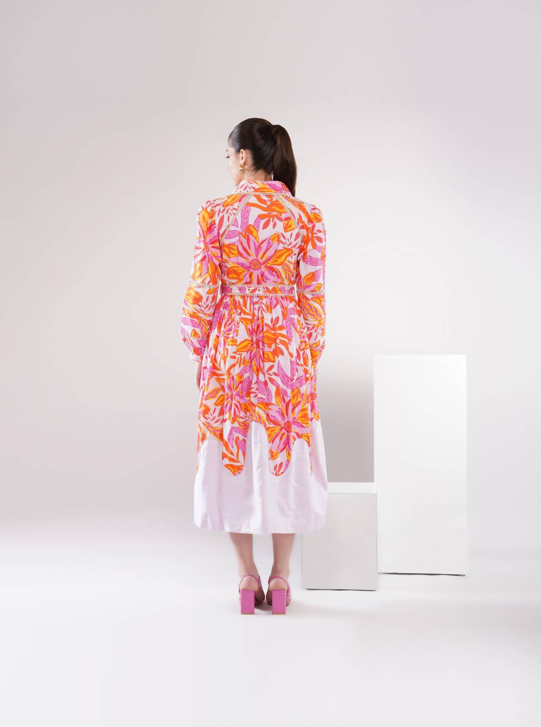 A vibrant long dress with full sleeves, lace detailing, and a button-up front. The eyelet belt cinches the waist, while the melting hemline blends bold prints with soft pastels, a balance of confidence and charm.